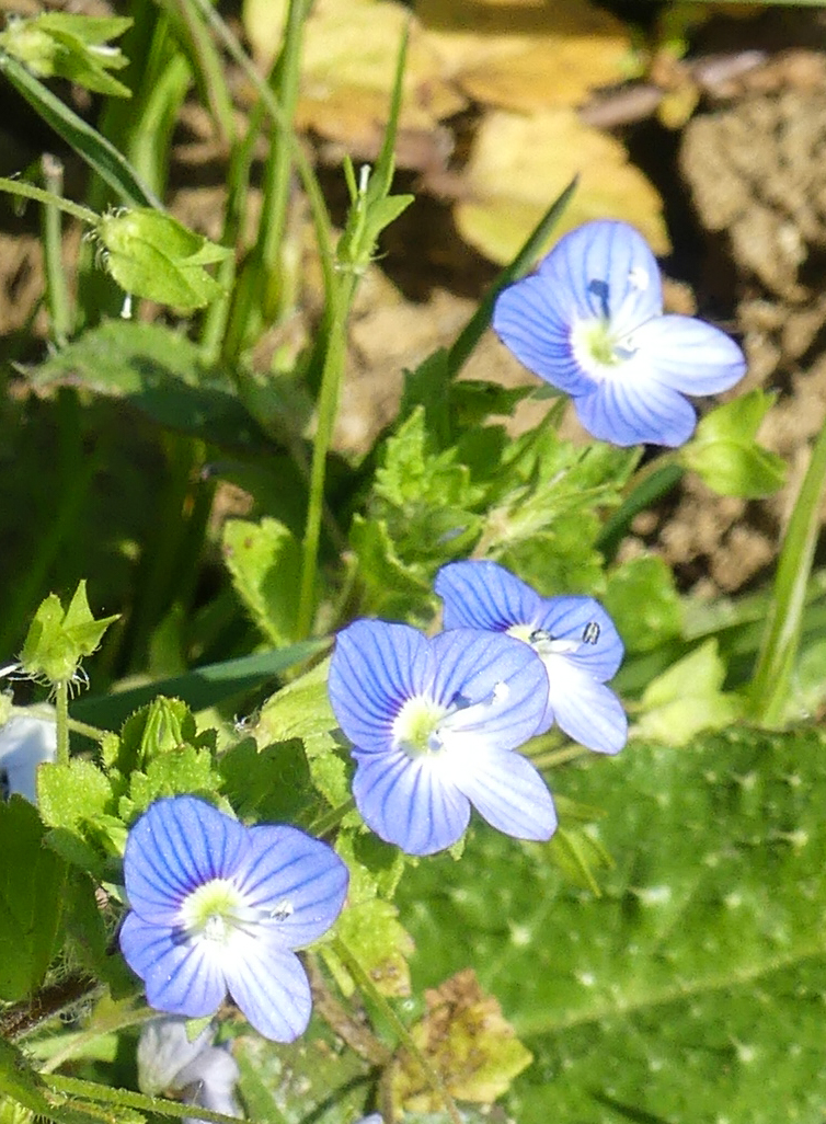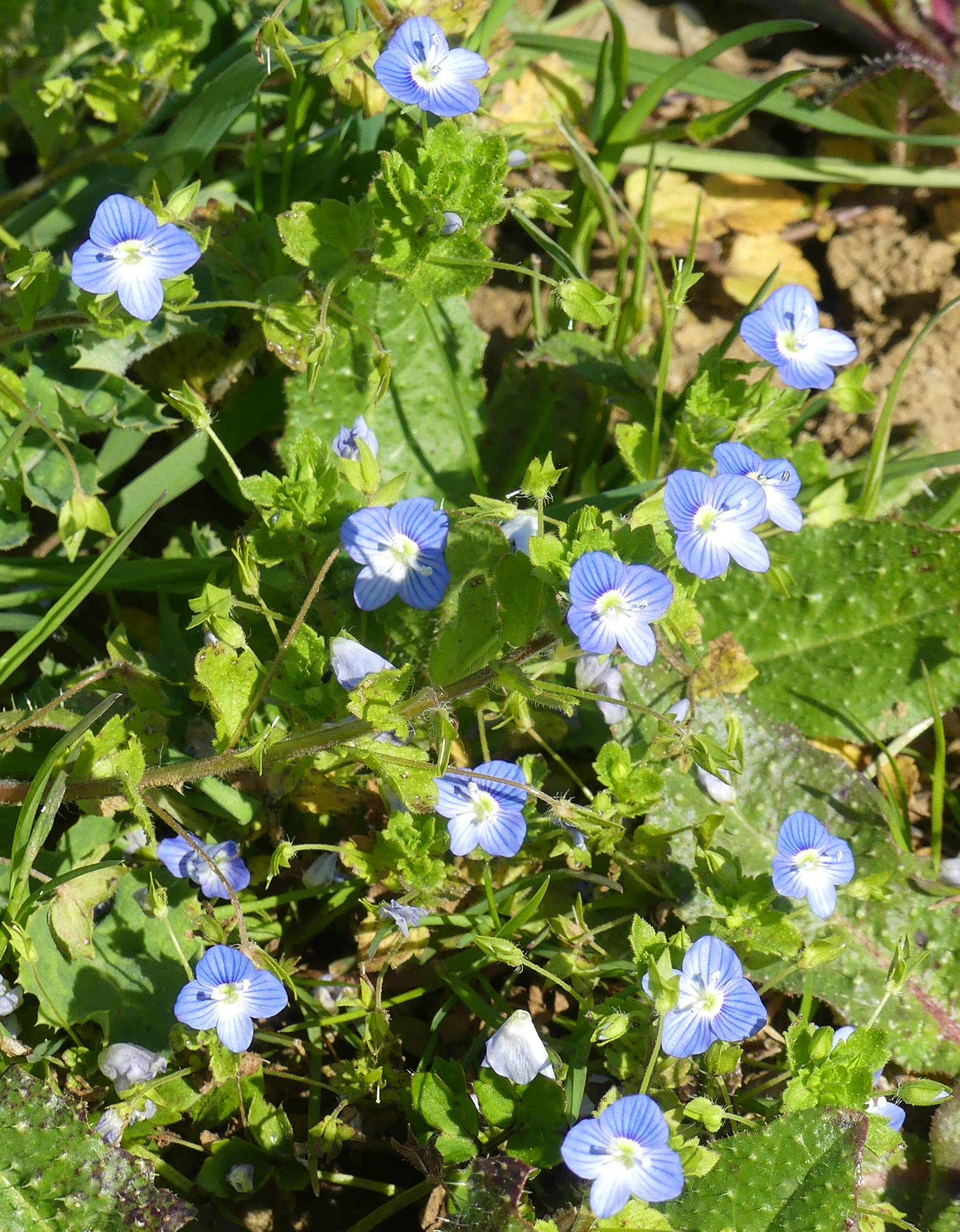 All over the field Common Field-Speedwell (Veronica persica) is opening small bright blue flowers. One petal (usually the lowest) of the flower is paler and smaller than the other petals, a useful way of telling it from other speedwells