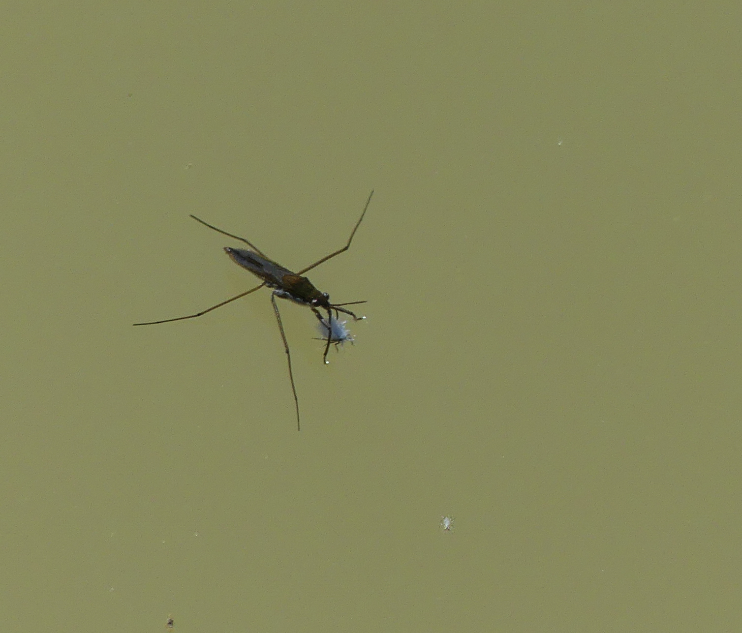 On the surface of the pond were several Common Pond Skaters (Gerris lacustris). I got close enough to one of them to photograph it and when I looked at the photo later found that it was holding prey in its front legs, a small insect that had probably dropped onto the water.