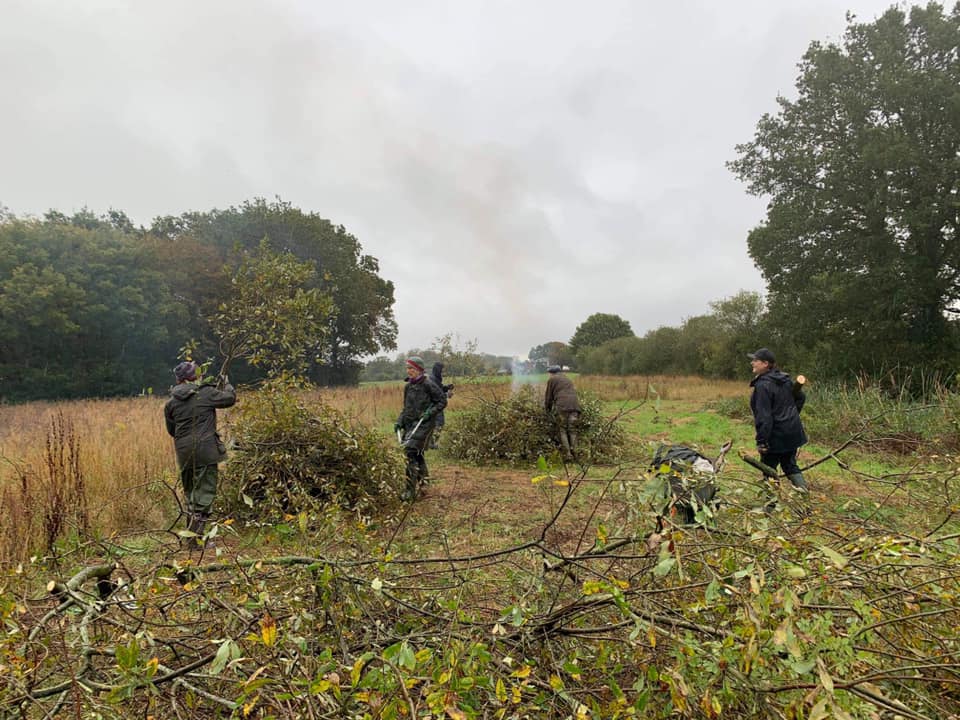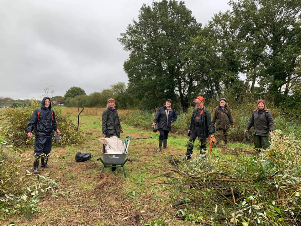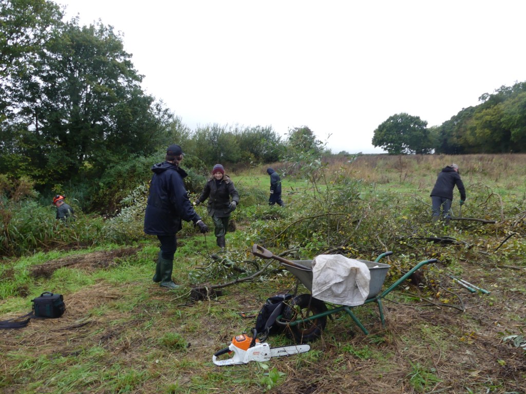 The steering group turned out in pouring rain on Saturday 3rd October to start work on the pond in Malster’s Little Field. In recent years the pond has been slowly reverting back to dry land as Reedmace and Goat Willow took over. We are removing some of this so that the thick layer of sediment can be cleared by machinery. Then we hope that the water plants and creatures will return. Plant seeds can lay dormant in the silt for many years just waiting for an opportunity to flourish again so we should see results quite quickly.