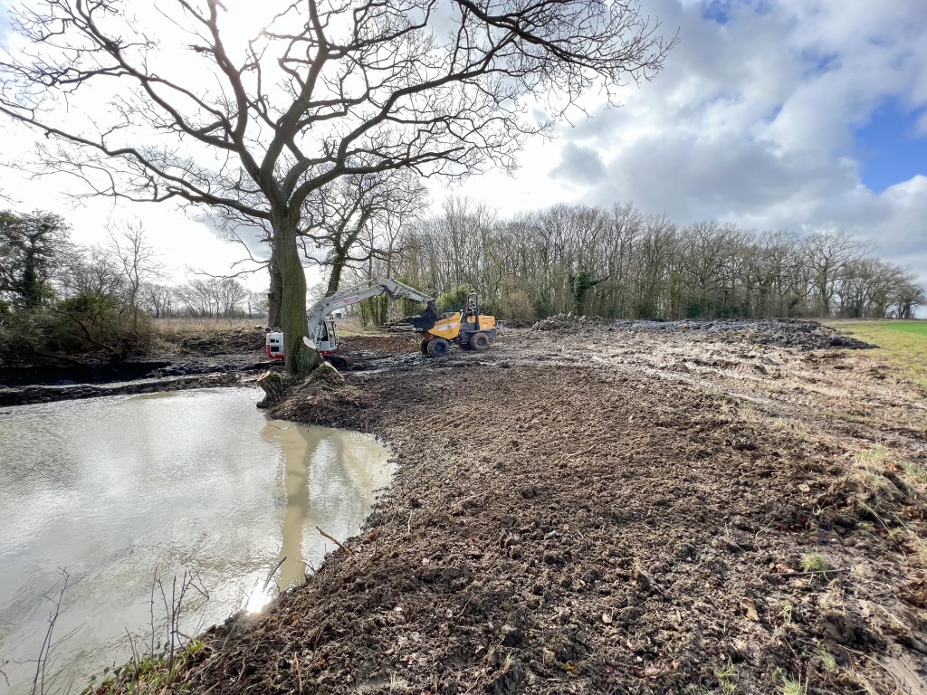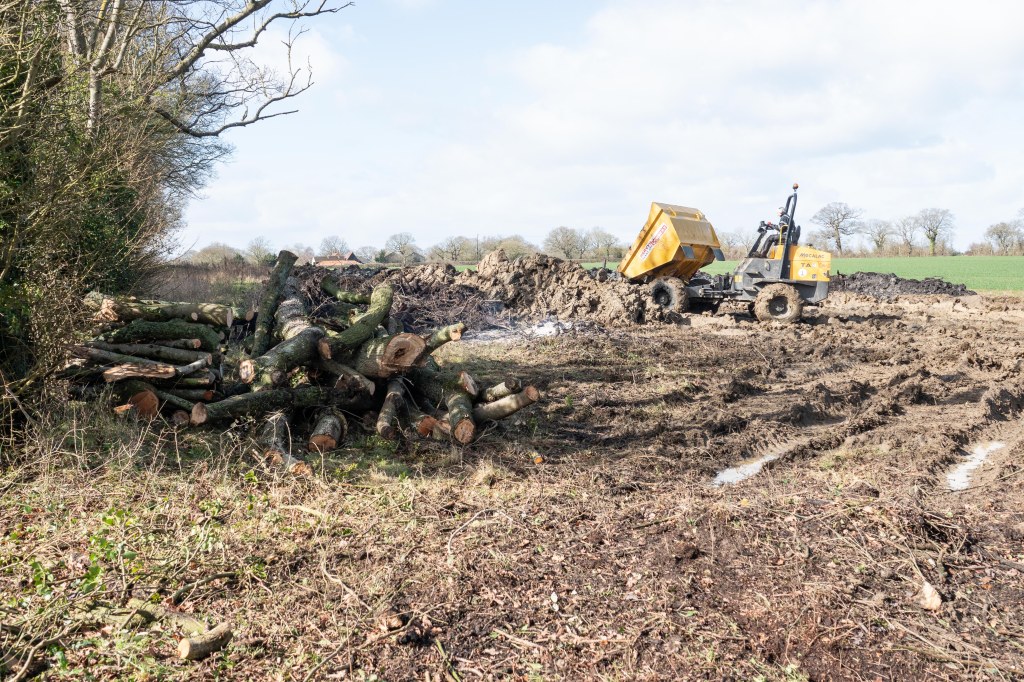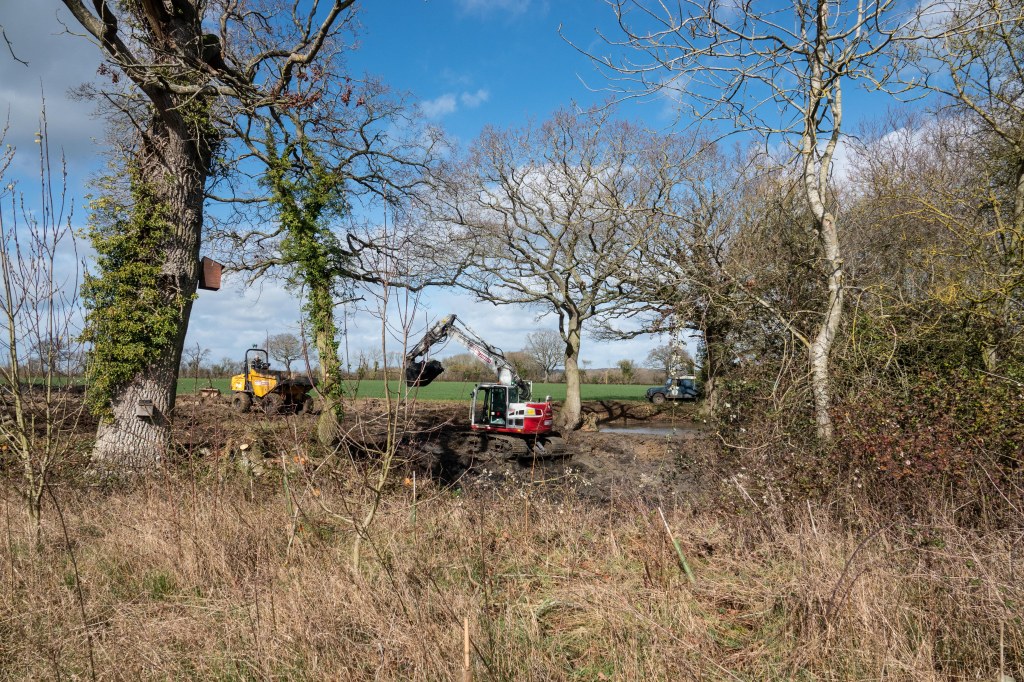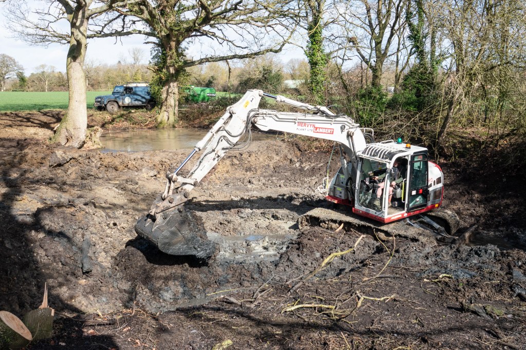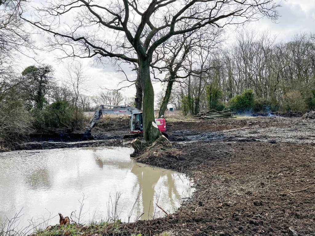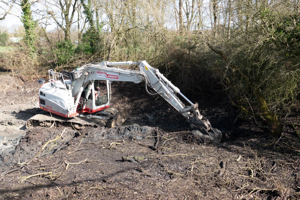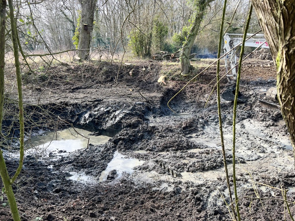 When we took over the management of The Copse (the small triangle of wooded land on the North side of Grove Piece) one of our priorities was to restore the pond, which had become very overgrown and silted up, so the pond supported very little life. We were lucky to have Crispin Chalker, who is an expert in pond restoration, living nearby, so we asked him to restore the pond for us. Crispin dredged out the silt, that was up to 1.5 metres deep, cleared some of the surrounding vegetation to let in some light, and felled a couple of large dead ash trees on the boundary with Grove Piece.There was a problem in know what to do with such a large amount of silt but Jon Hunt, who owns the field adjoining Grove Piece, kindly allowed us to spread it out over the uncultivated part of the field. There will be a long dormant seed bank in and around the pond so we are looking forward to seeing what appears, not only in the pond, but also on the spread out silt. Stoneworts, which thrive in newly dredged ponds, are one group that we will be watching for, especially as one rare species grows in the Malster’s pond and even rarer species have been found in other recently restored local ponds. This spring, primroses, which had been almost hidden on the edges of the pond, burst into flower and around them a host of new seedlings promise an even better show next year.
