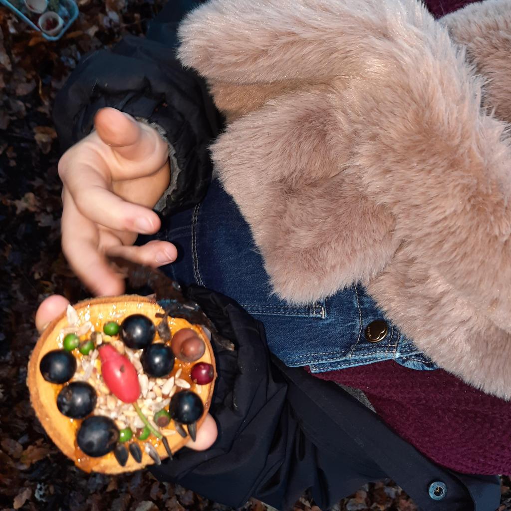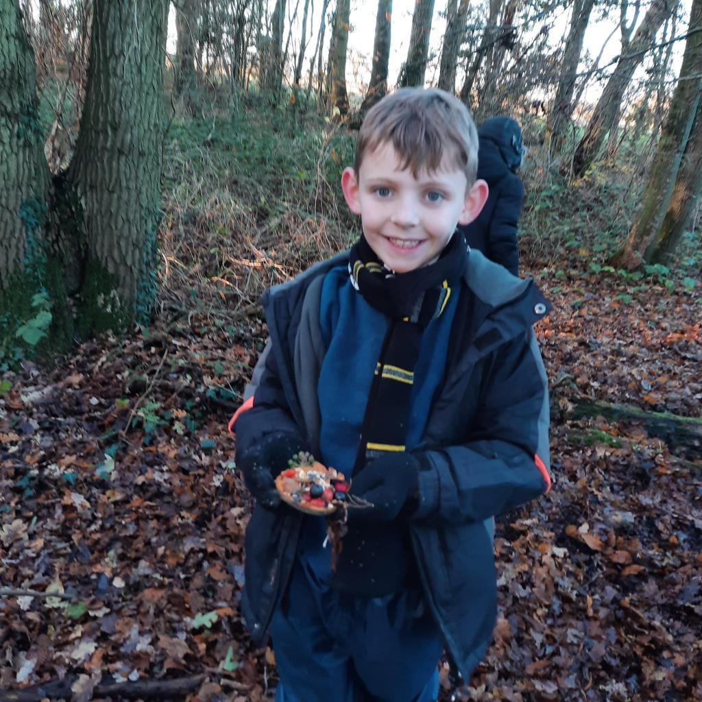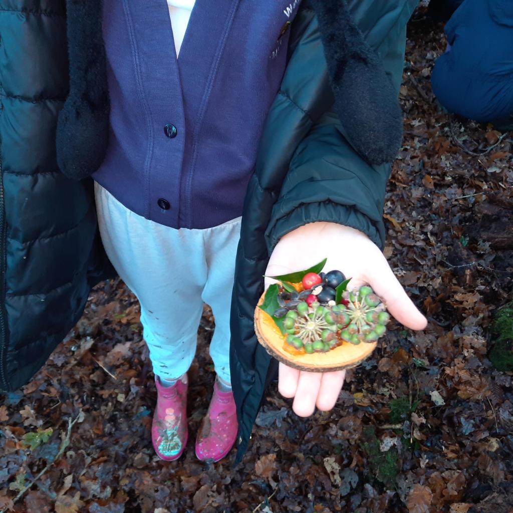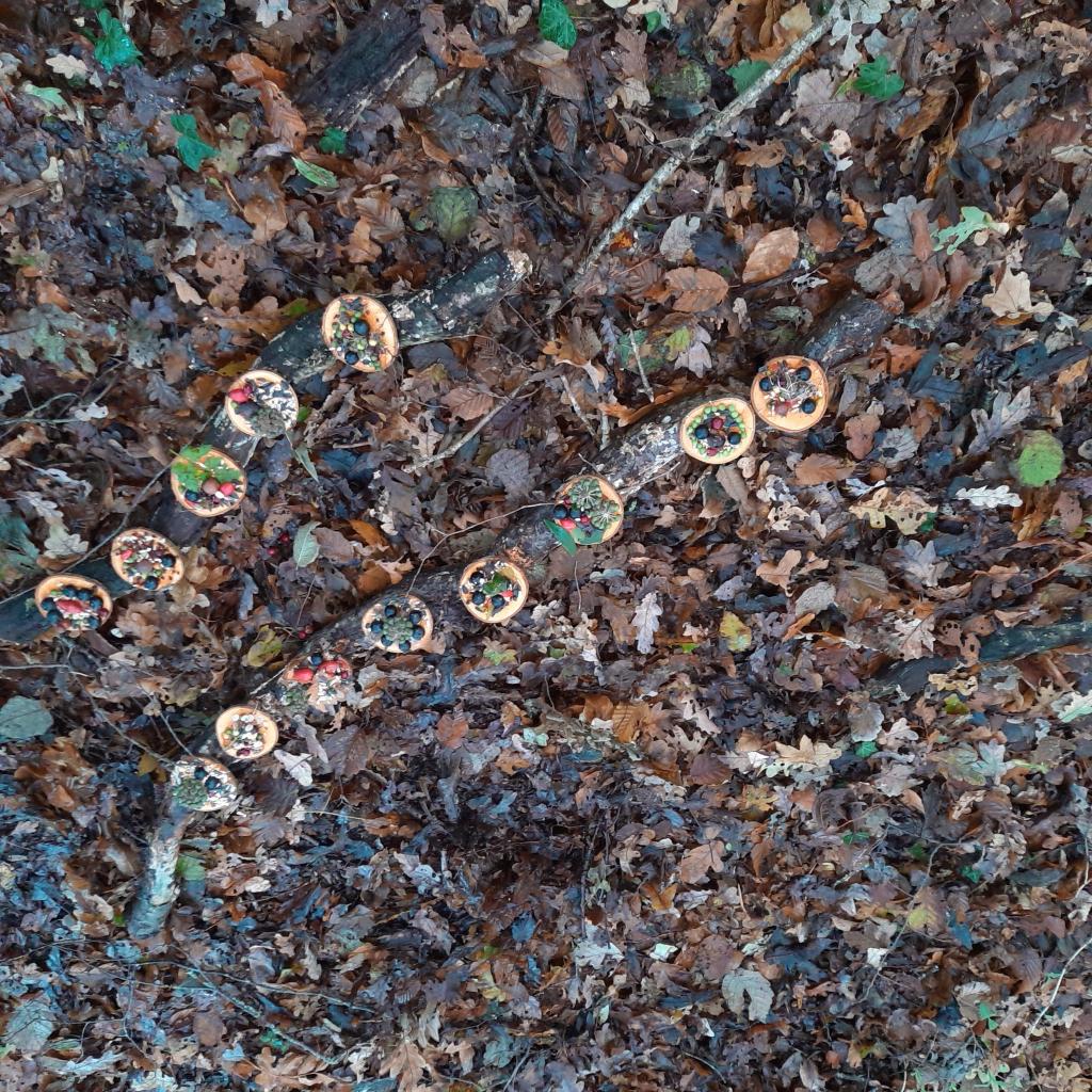 Jo Jarvis took a group to decorate slices of wood prepared by John for the activity. The children smeared apricot jam over the wood and then placed seeds and berries decoratively over the surface. The discs were lined up along mossy, fallen tree trunks and left for the wildlife to enjoy.