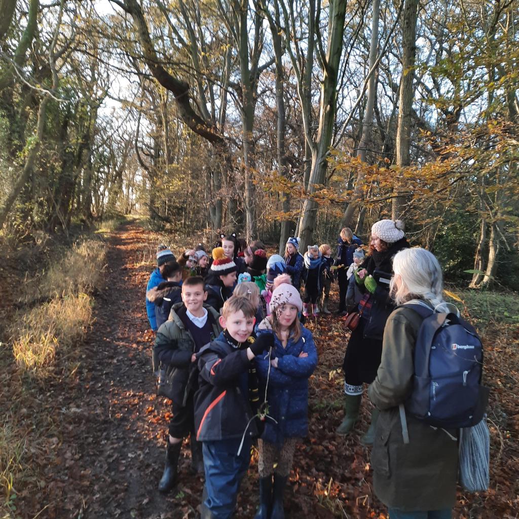 Saplings class of year 3 and year 4 children of Wenhaston Primary School gathered in Grove Woods with sparkling winter weather.