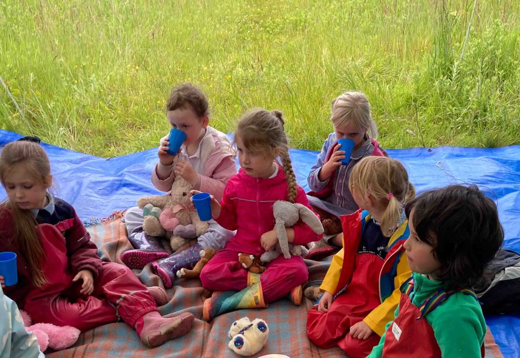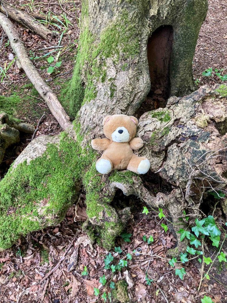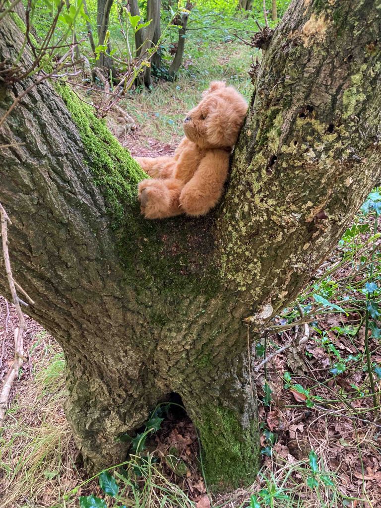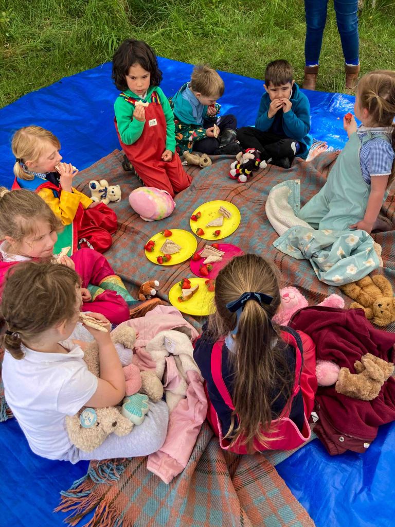 Wenhaston Primary School Reception Class, Acorns, found twelve teddy bears hiding in Vicarage Grove today and took them along with their teddies from home to a picnic in Grove Piece. The weather was unsettled so we spread out the blanket under a gazebo and enjoyed a cup of elderflower cordial, made from flowers collected during a forest schools session. The raspberry jam sandwiches made in school by the children did not last long and then there was plenty of fruit to follow, apples, oranges and strawberries. Most picnickers even found room for a few potato sticks. Rested and fortified the class then made their way back to school in the rain.