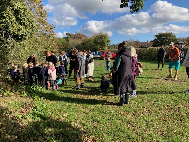 The children were very enthusiastic and the acorns were everywhere so they collected lots to plant. Before we returned to school we took the class to the new field and showed them how it looked at the very beginning of the new project. The children found eight oak seedlings in the field and talked about how they got there. They left a cane beside each one so that we can rehome the trees while the field is prepared for planting.