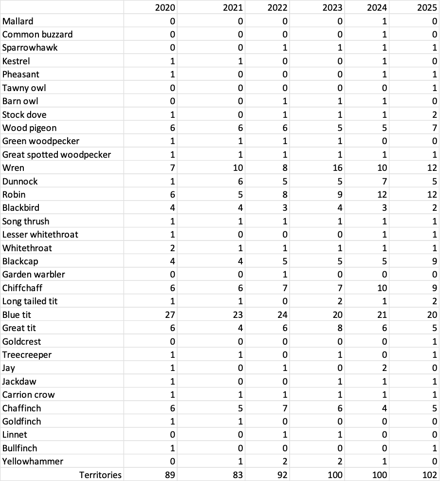 No major changes to species totals but the large boxes had interesting occupants, stock doves nested in both the barn owl and tawny owl boxes and tawny owls nested in the stock dove box. The tawnies raised just single young to fledging, the second nestling disappeared possibly eaten by his sibling, however the survivor was ringed and unfortunately was found dead a few months later having been hit by a car at Bramfield. The overall trend is for the number of territories to gradually rise indicating a more favourable habitat than the barley fields the site was just 7 years ago. The increase in scrub is starting to show effect with the steady increase in the numbers of blackcaps, wrens, robins and long tailed tits.